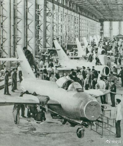 1956年7月19日,國產(chǎn)第一架噴氣式戰(zhàn)斗機在沈陽首次試飛成功,標(biāo)志著中國具備了獨立研制空軍武器裝備的能力。圖為國產(chǎn)第一批噴氣式飛機即將出廠。